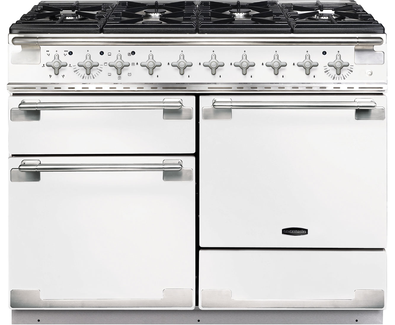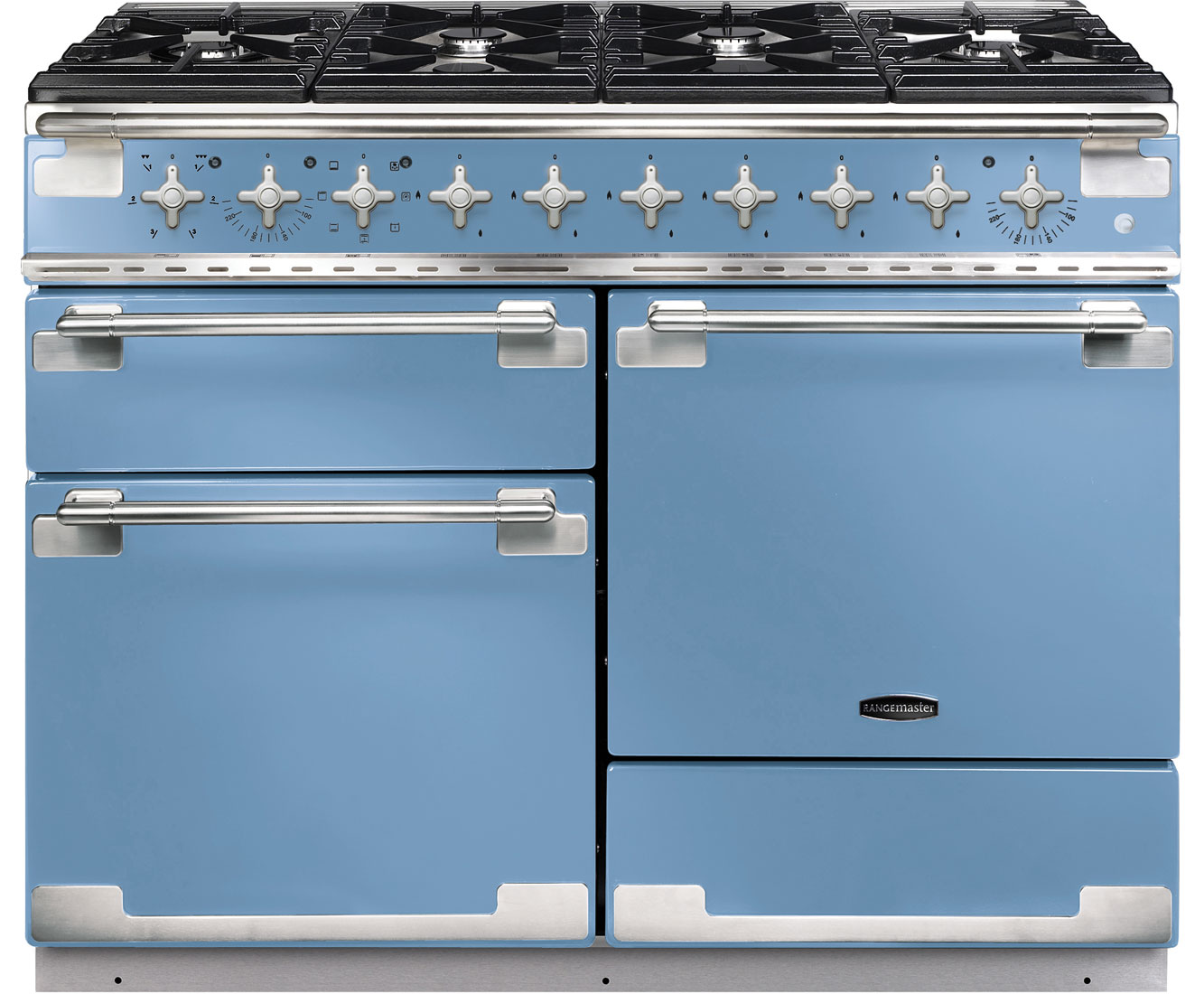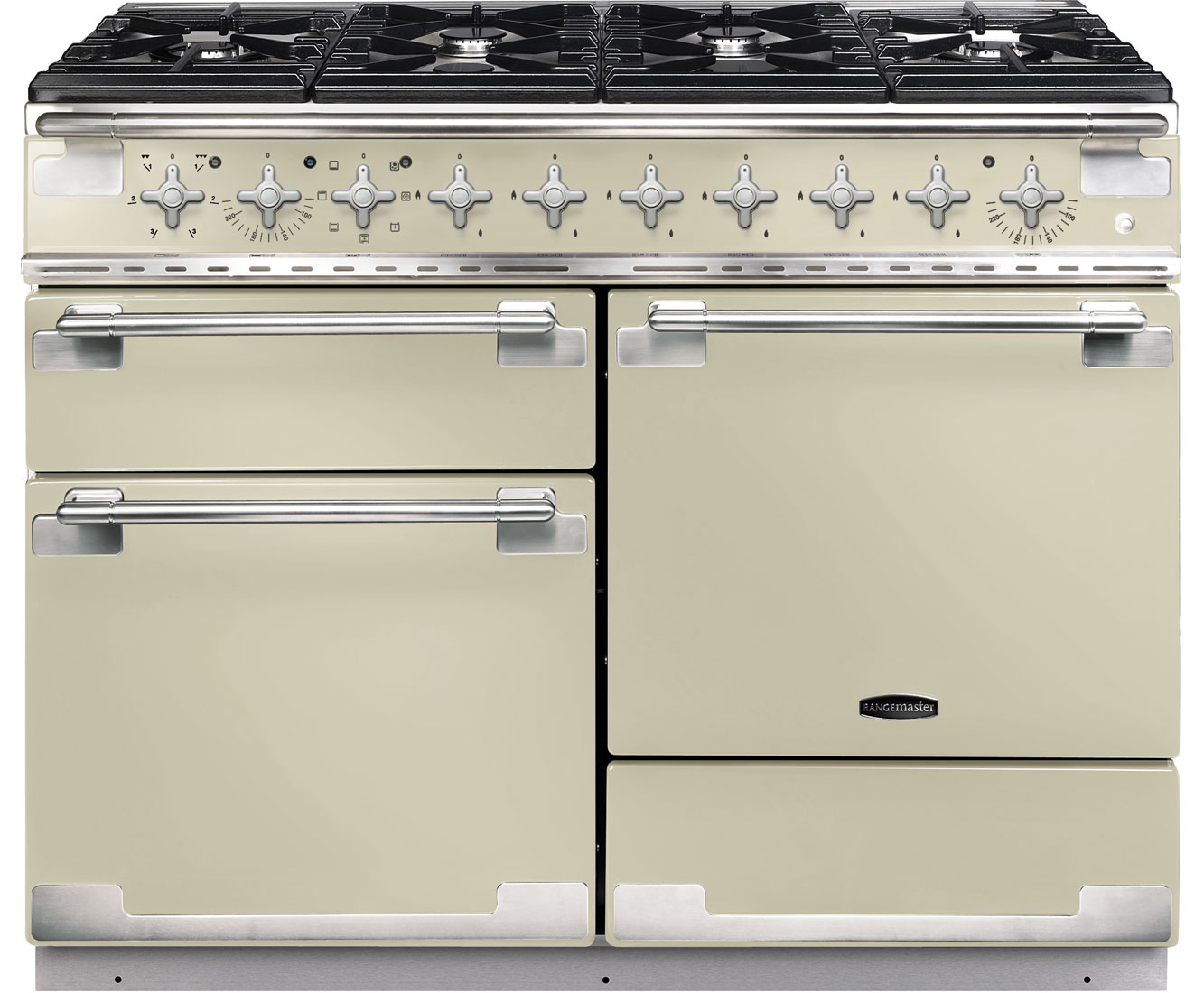 Premium cooking from Rangemaster. Create the perfect dish using the Rangemaster ELS110DFFOR dual fuel range cooker. Standing at 110cm wide, it’s a feature appliance for any kitchen. It has 4 separate sections, including a multifunctional oven, grill and storage drawer for your pots and pans. The cooker has 6 burners, each complete with cast iron pan supports. You can whip up a quick meal or a gourmet dish with time to spare. The 69 litre multifunctional oven has 7 different cooking functions, so you can cook perfect pizzas or melt cheese on a yummy pasta bake with the kids. Plus, it has a storage drawer for baking trays and pans so you won’t lose track of your bakeware!