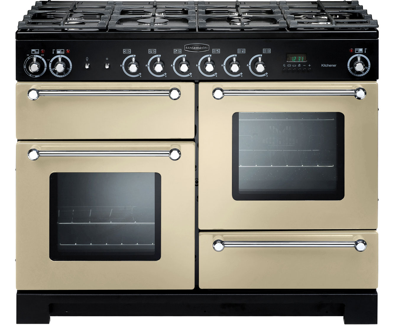 The Rangemaster KCH110DFFCR/C Range Cooker comes in a cream / chrome colour. The KCH110DFFCR/C has an efficient A energy rating. This Range Cooker has a electric conventional oven oven. The KCH110DFFCR/C main cavity capacity is 67 litres, which means plenty of space to cook for larger families. The flame safety device senses when the flame has been extinguished and automatically cuts off the gas supply preventing a dangerous gas leak. To offer peace of mind the Rangemaster KCH110DFFCR/C free standing Range Cooker also comes with 2 years warranty.